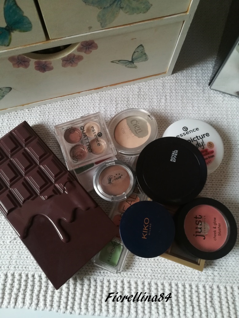 - palette di Essence 01 Ciao Bella!: primissime palette di Essence a quattro colori. Ne ho altre due che dovrò rispolverare perchè son ancora buone ed è un peccato lasciarle nel cassetto. Questa ha colori che sfrutto davvero tantissimo perchè son dei bellissimi marroncini. Ho già finito un colore e un secondo è in fase di arrivo infatti l ho depottato in una jar ma lo vedrete poi nel post dei prodotti che voglio smaltire.